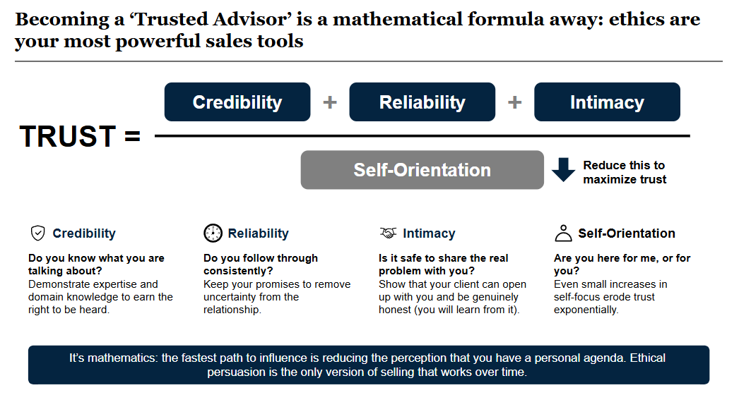 Because I am an engineer, I like formulas for everything. In their popular book The Trusted Advisor, David Maister, Charles H. Green and Robert M. Galford show that trust is a calculation: