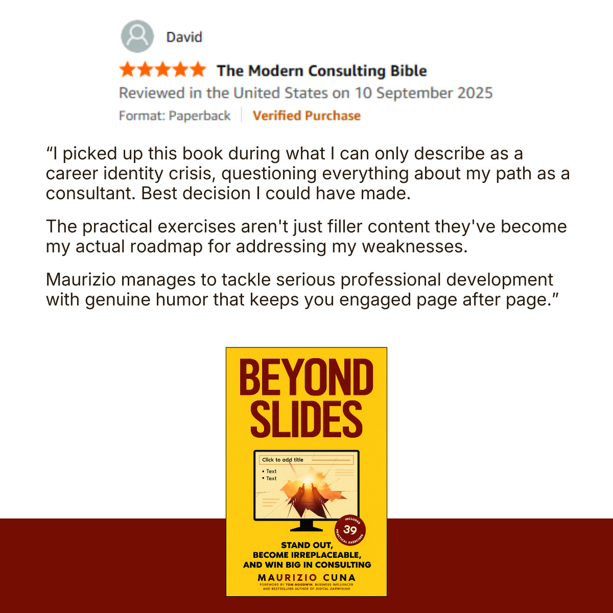 My first book Beyond Slides became a #1 Amazon Best Seller in the USA, UK, Australian and Italy. This is a review from a reader: