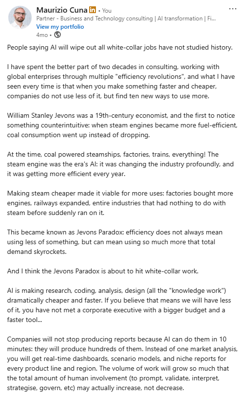 I am not convinced we are staring at mass unemployment tomorrow. In my view, the more interesting question is whether expectations for products and services simply explode. If every firm can build 3–4x more, does that mean fewer jobs… or just a much higher bar for what “good” looks like? Are we staring at the modern instance of Jevons paradox, as I discussed in this LinkedIn post?