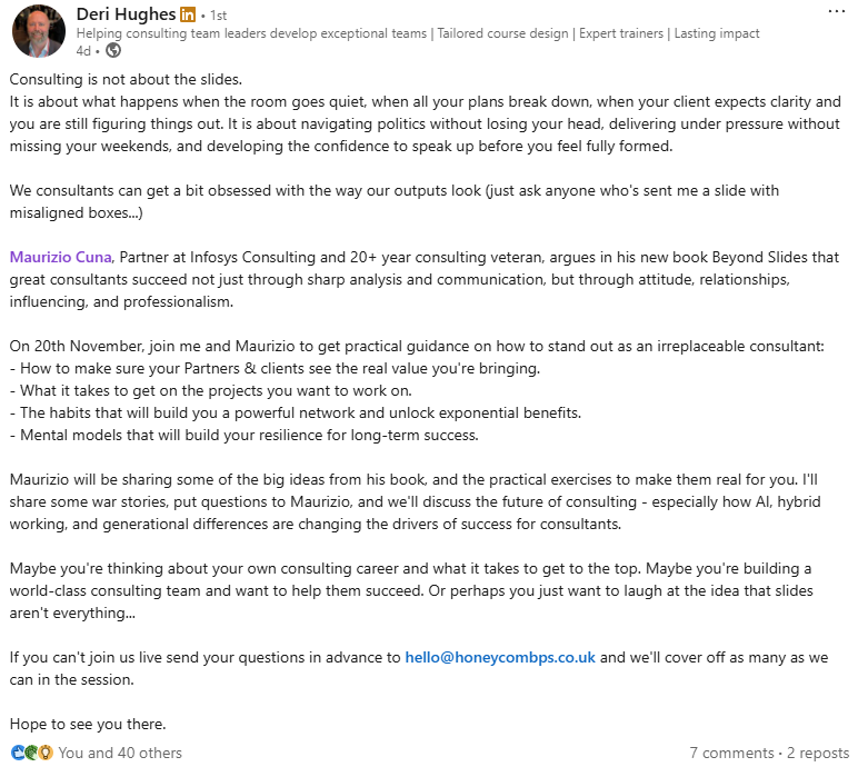 I recently spoke with Kenny Alami on a broad range of topics: from what I think AI will do to consulting, to how I use AI tools every day to increase productivity. This was a good conversation, so have a look if you are keen!