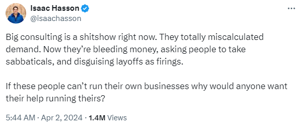 These issues didn’t lead to a full recession (at least, not yet) but made companies very cautious about spending money, including splurging their budget on consulting gigs.