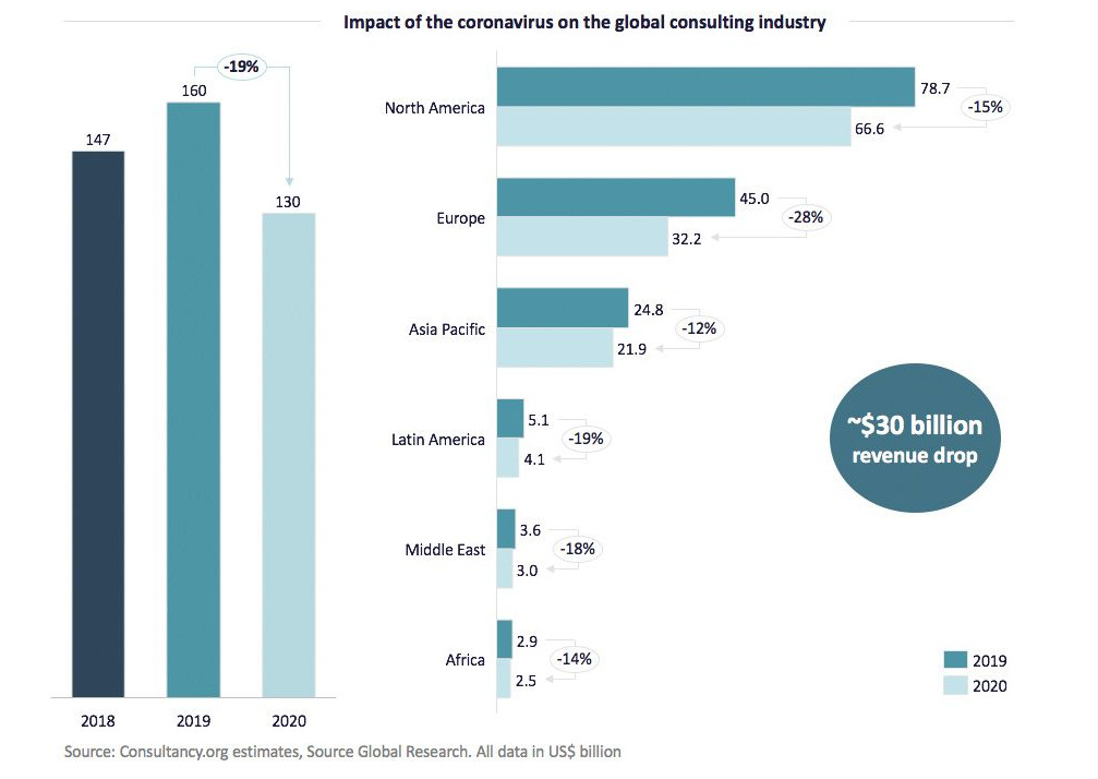 These estimates show that Covid-19 reduced the size of the consulting industry by 19%, from $160 billion in 2019 to $130 billion in 2020.