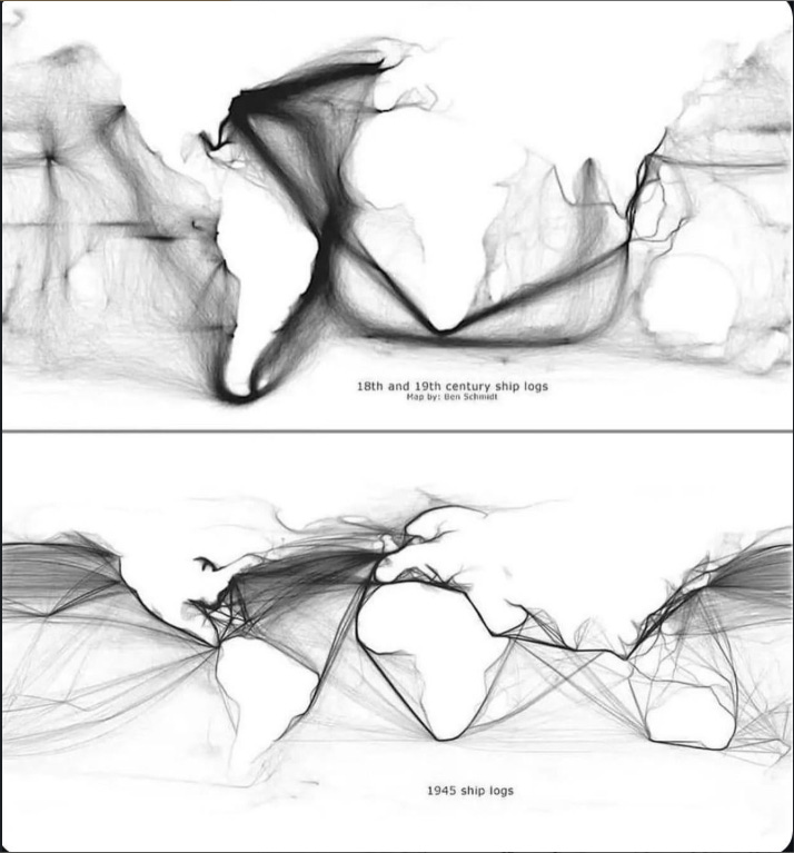 The Atlantic emerges. Trade winds appear as if drawn with charcoal. Even small islands show up as bright knots of traffic.